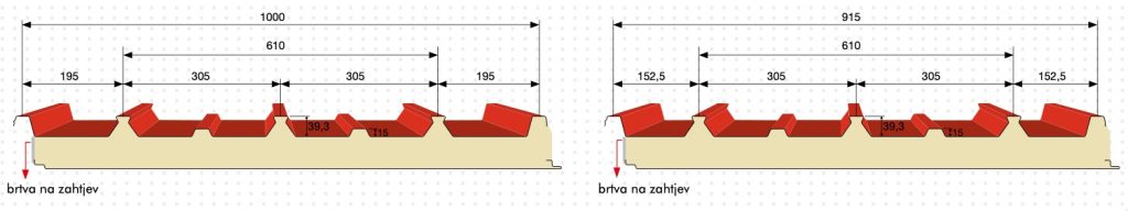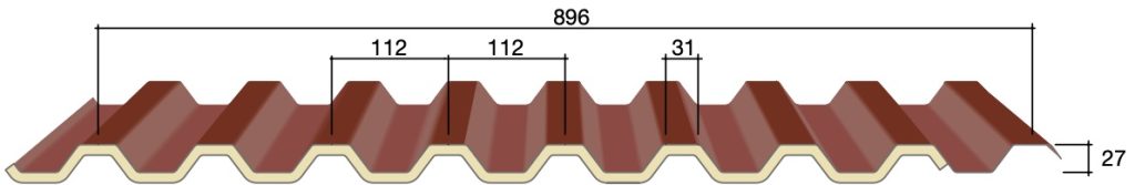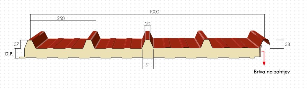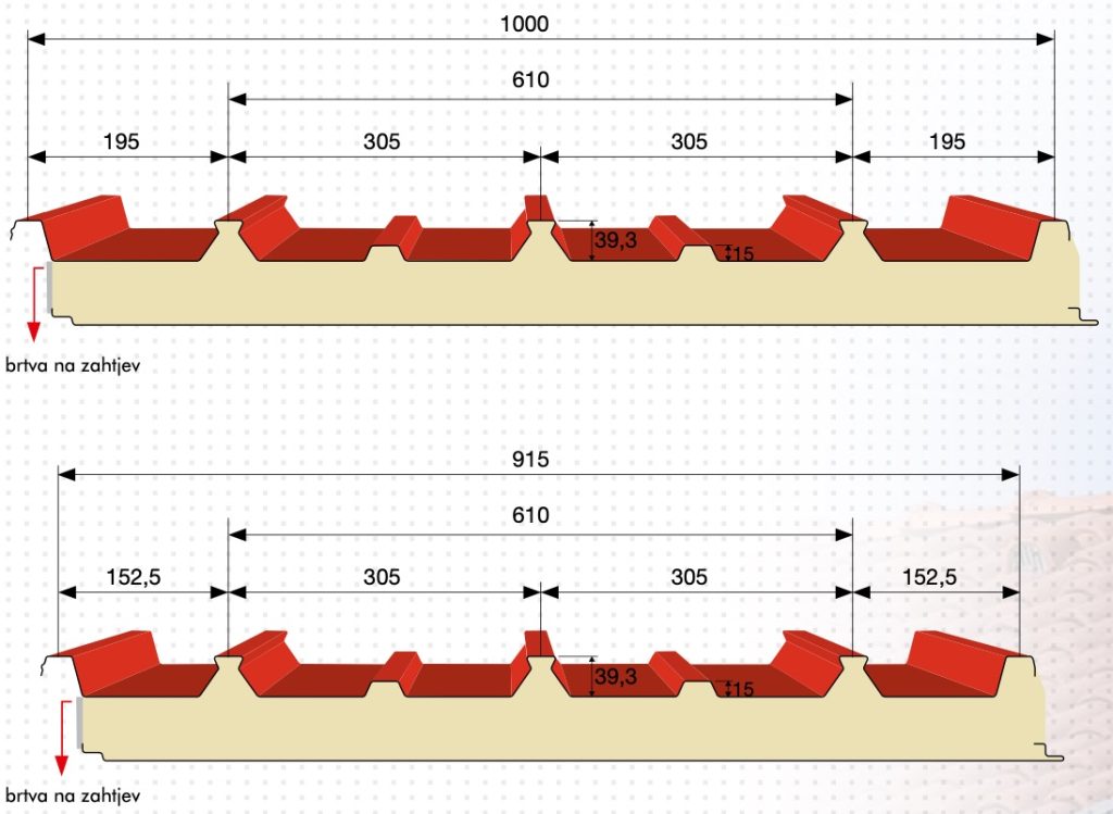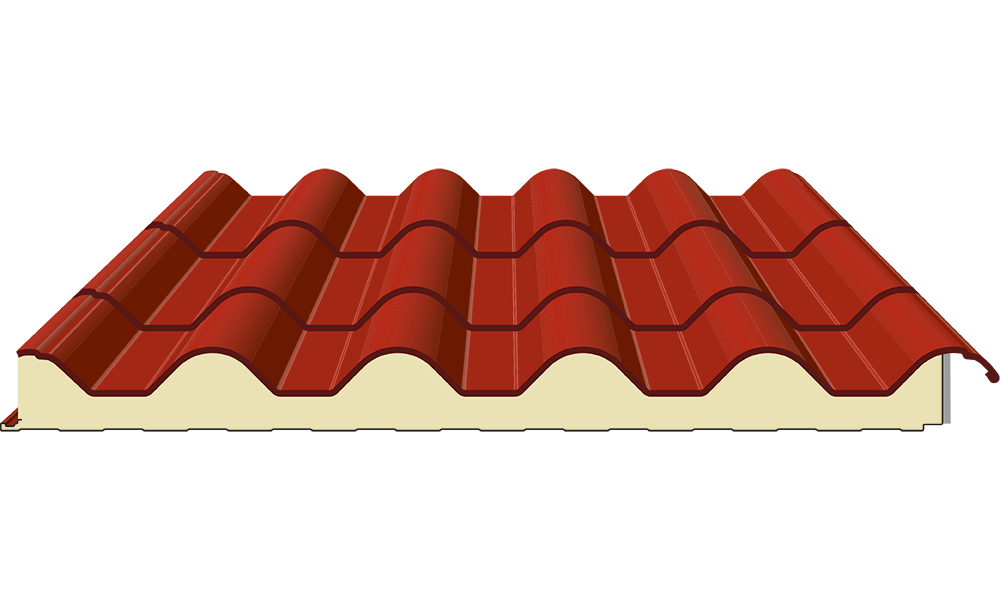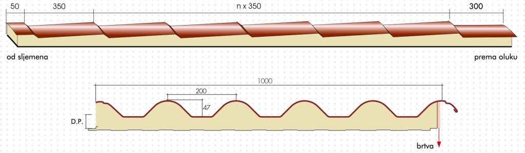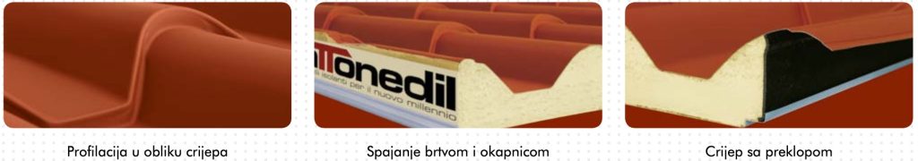 Metalni sendvič panel sa izolacijom od ekspandiranog poliuretana. Širina: 1000 mm. Gornji nosač: pocinčani prefarbani čelik, aluminijum i bakar. Donji nosač: pocinčani prefarbani čelik; na zahtjev su dostupni drugi nosači i boje. Dužina panela je određena poprečnim presjekom crijepa čiji se skenirani crtež nalazi ispod teksta, sa stalnom dimenzijom od 350mm.